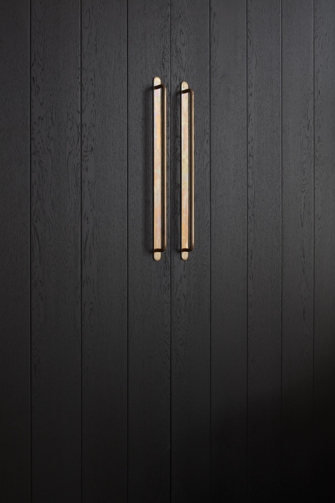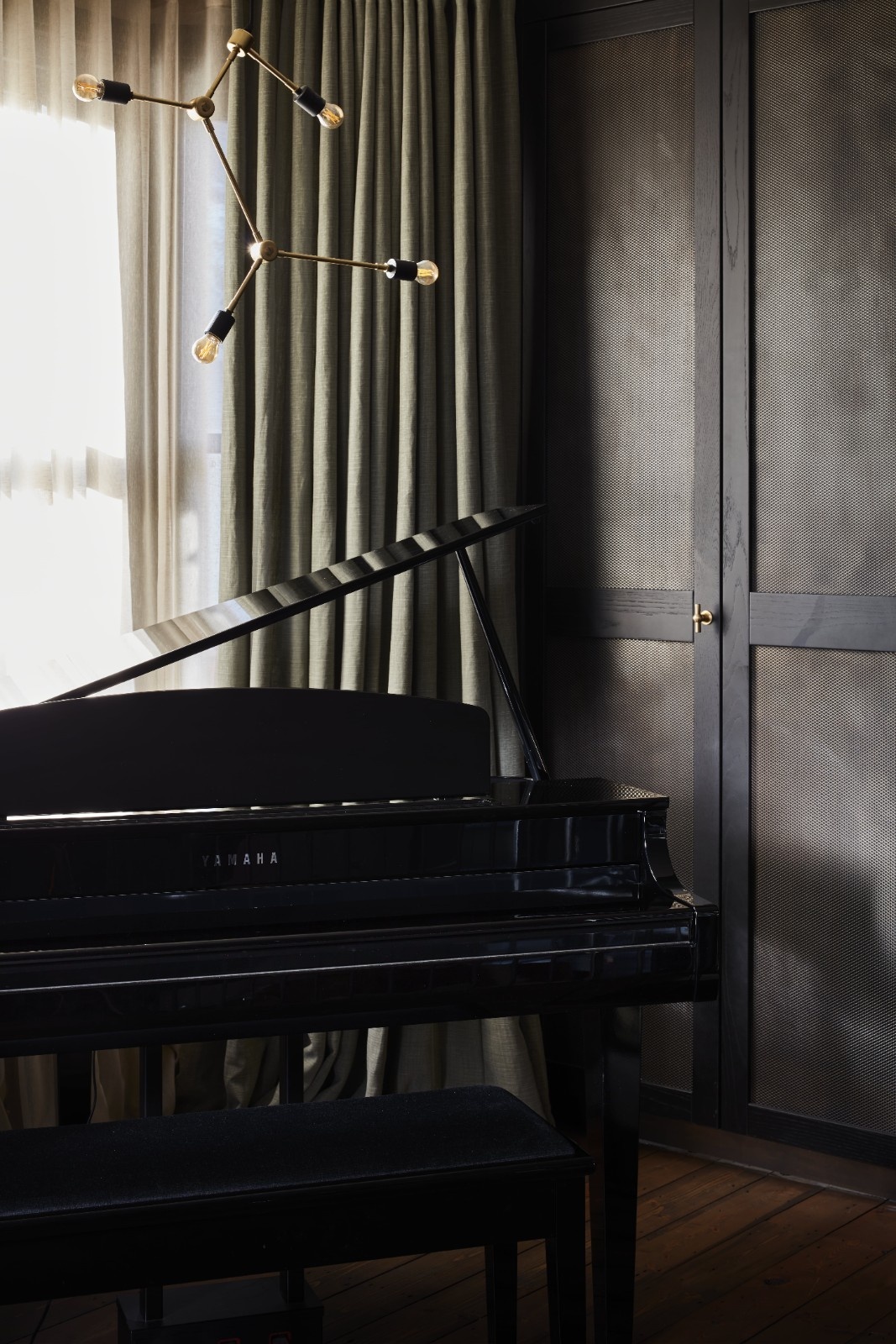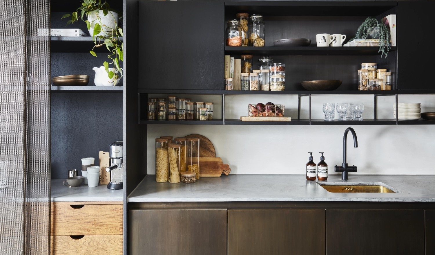 The project was completed using a variety of materials, including black oak, steel, polished concrete, brass, and brass mesh.