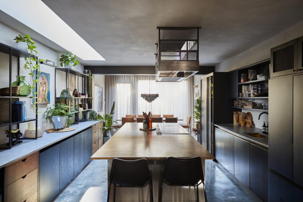 - Industrial-style kitchen with brass kitchen island